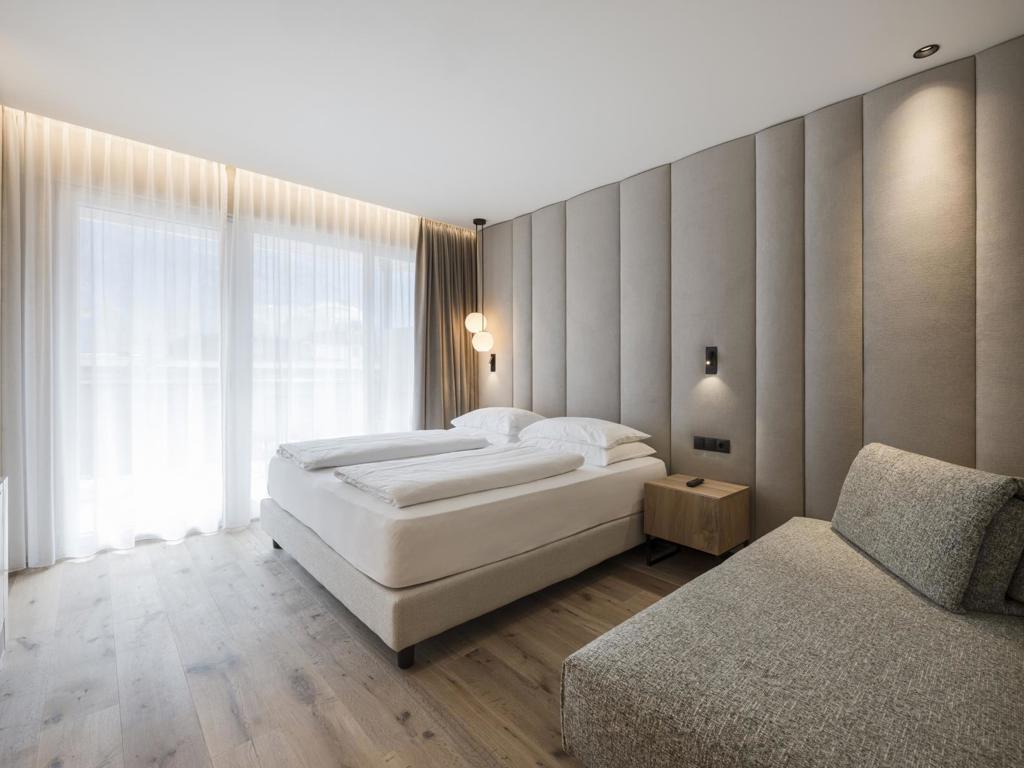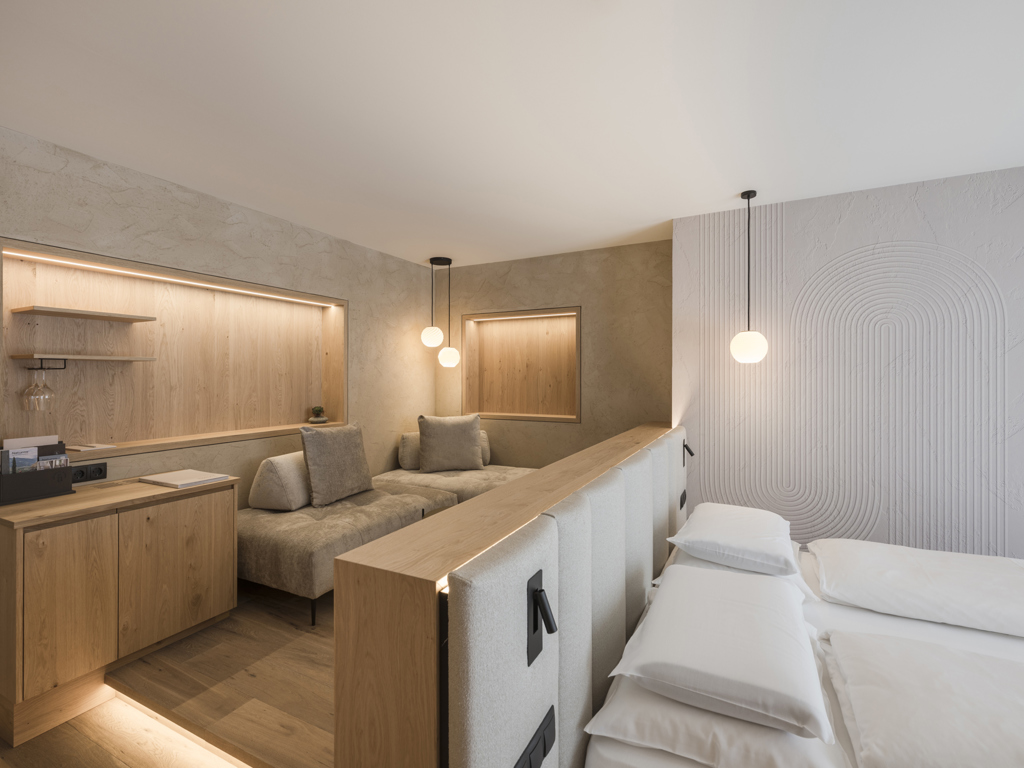 Mehr Raum für mehr Wohlgefühl. Mit exklusiv ausgestattetem Wohnraum mit gemütlicher Sitzecke, Holzboden, Naturholzmöbeln, separatem Kinderzimmer mit zwei getrennten Betten, modernem Badezimmer mit großer Walk-In-Dusche, Doppelwaschbecken, separatem WC, Minibar, Safe, 3 Flatscreen TV, Telefon, kostenlosem WLAN, Nordbalkon, Garagenplatz und Klimaanlage.