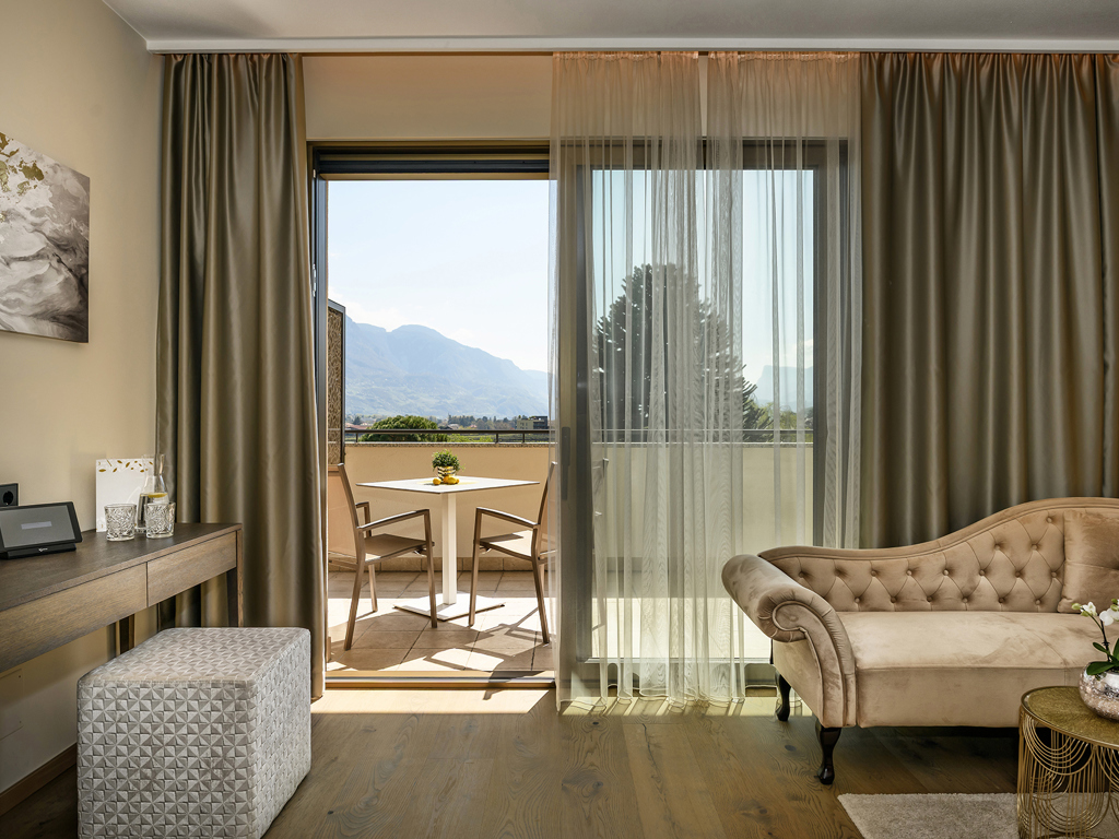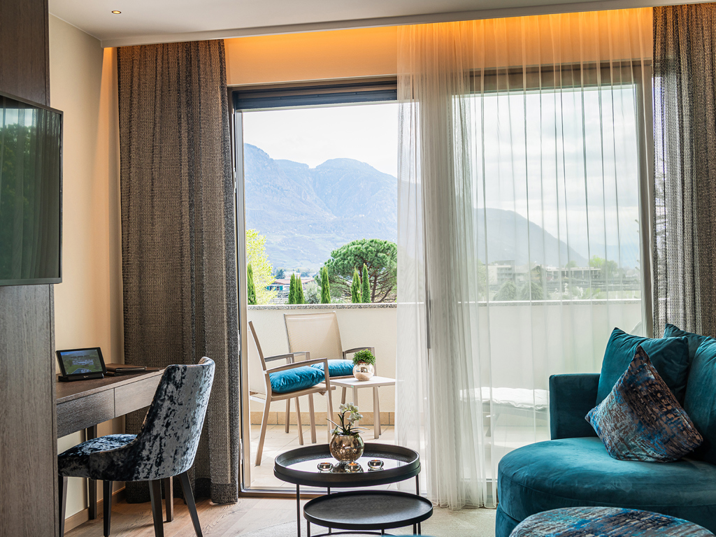 Modernes, geräumiges Zimmer (ca. 32m²) zur Gartenseite. Südbalkon (+7m²) mit Nachmittagssonne und Panorama ins Meraner Land. Wohnsessel, Schreibtisch, Parkettboden, Minibar, Safe, TV mit Radio, SuitePad, WLAN, Badezimmer mit Dusche, Bidet, Föhn, Bademäntel, Einzelraum-Klimaanlage