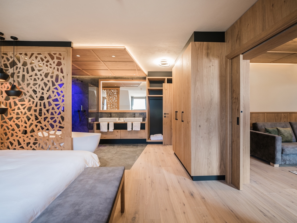60 m², Balkon mit Kronplatz-Blick, Holzboden, Infrarotkabine, separates Kinderzimmer mit Stockbett, Badezimmer mit Badewanne und Dusche, WC, Bidet, Haartrockner, Safe, Minibar, Nespresso-Maschine, Telefon, Schreibtisch, Flat Sat-TV, kostenloser WLAN Zugriff, Wellnesstasche mit Bademänteln und Handtüchern